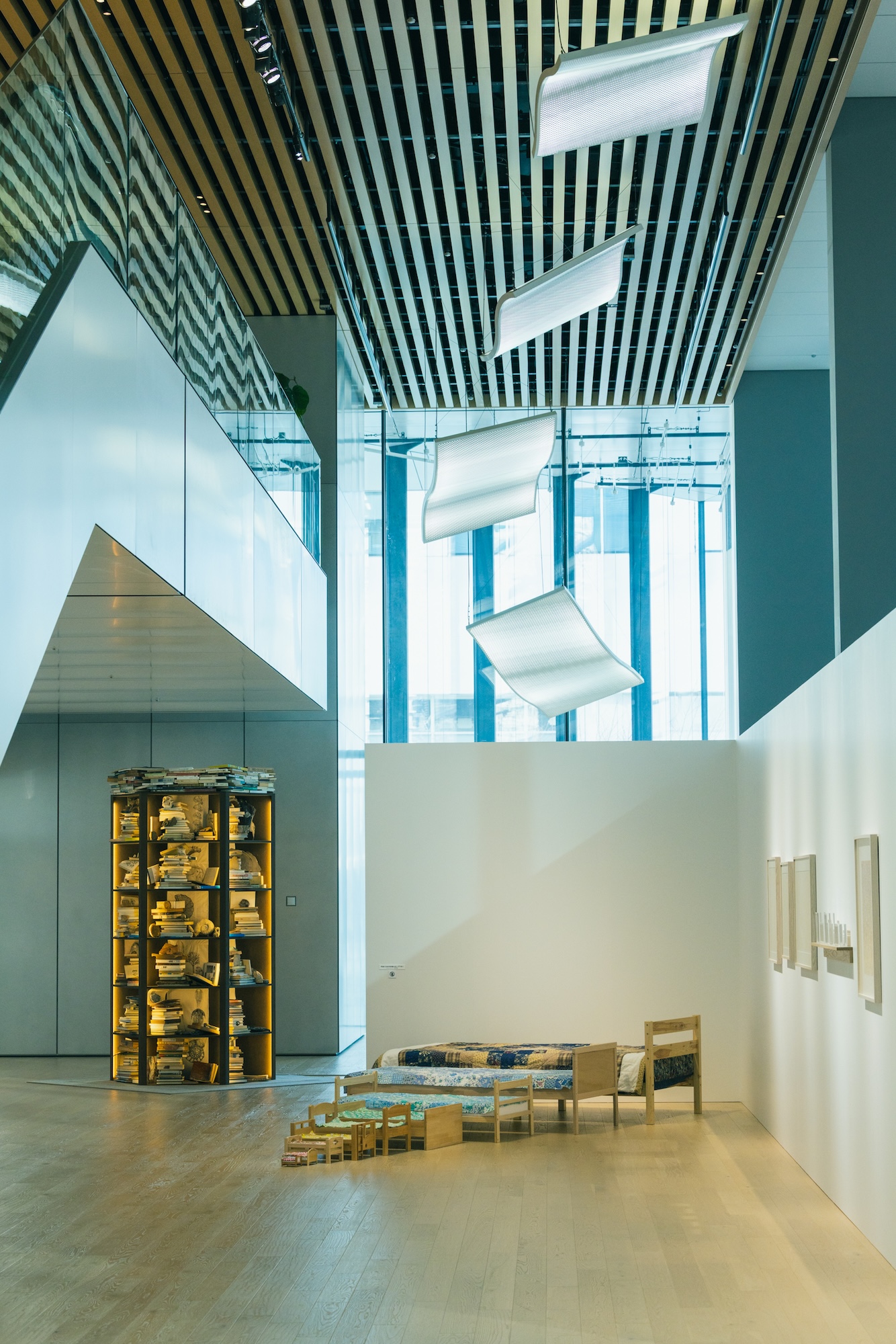 地層は、生物の生態や自然環境の情報が刻み込まれた「歴史書のようなもの」という例えから着想を得て、「Shiseido Beauty Park」2階の床から3階の床下まで連なる本棚に、約500冊の本と、そのあいだに鉱石や化石を配置し、生物の誕生から人新世までの時と知の連なりを表す。
